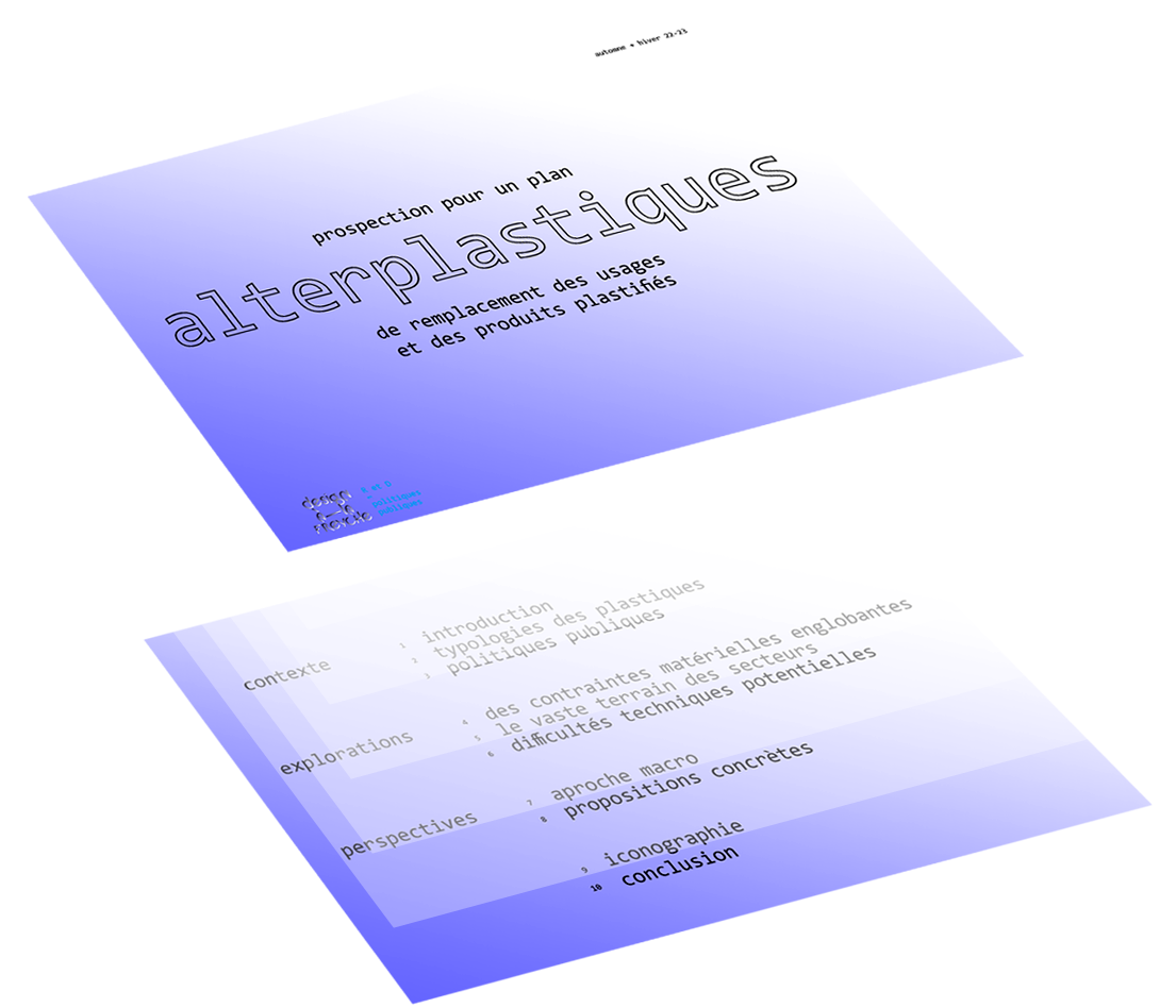 alterplastiques, RetD pour renouveler nos rapports et usages à un matériau inévitable. Précédée par: l'emballage des produits • 2020-23 • L'application des lois de transition écologique est complexe et appelle plusieurs types d'anticipation. Des stratégies sectorisées sont à planifier: quels matériaux rares pour quels néo-usages, quelles médiations, des (rétro)innovations ? In fine, proposition d'une boîte à outils pour concevoir et utiliser autrement des produits plastifiés. Ce travail prolonge une précédente étude: downsizing, coloration et encrage, nomadisme alimentaire: les fonctions fondamentales de l'emballage - hygiène, conservation, mesure, identité visuelle, usages - sont portées par des formes anachroniques. De la matière première à la post-consommation, les normes de protection sont-elles à jour des enjeux ? Des synthèses thématiques et entretiens avec des spécialistes - histoire, droit, sérigraphie - génèrent une série de dispositifs à l'intention des pouvoirs publics, des producteur·ices et des usager·es.
