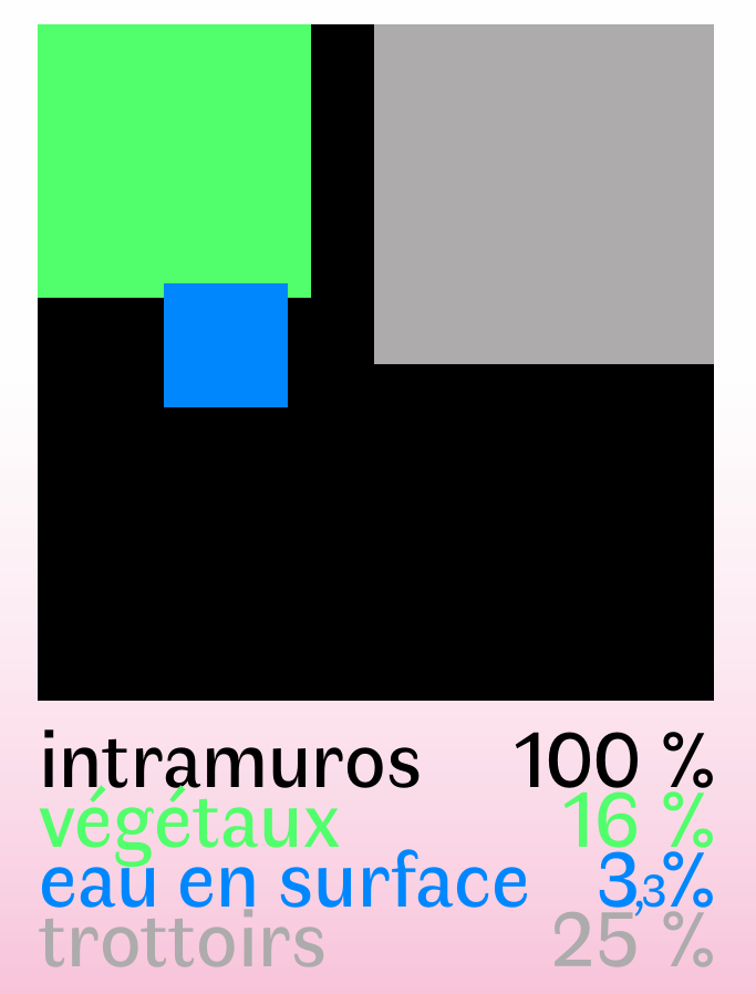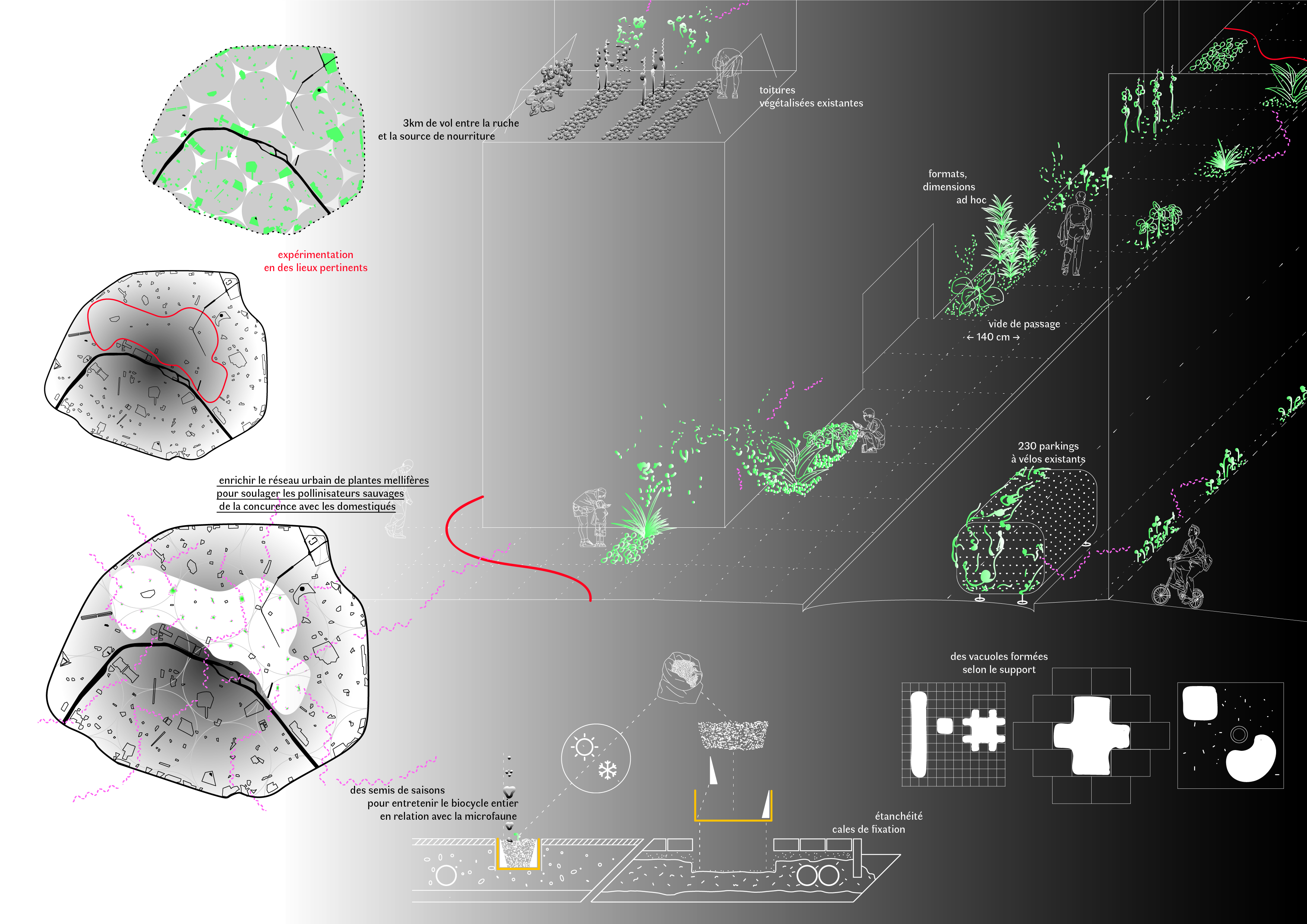 vacuoles urbaines • concours Faire • 2020 • Il manque au sol quelque chose qui permet de décarboner l'air, de nourrir les biodiversités, de réguler les températures. Le trottoir est la peau de la ville. L'alternance du bitume, des pavés et des dalles rythme le sol urbain. Un sol excessivement compacté et anoxique. Il manque quelque chose qui loge la composition d'un milieu vivace. Il manque au sol son état primitif. La ville est principalement grise, résiduellement verte, très partiellement bleue. Une certitude: la ville n'est pas la campagne. Une deuxième certitude, ce rapport constant: du degré de contrôle d'un espace jardiné, on peut déduire la force de sa diversité.Créer un brin d'herbe ex nihilo, en laboratoire, est impossible. Et les extensions végétales urbaines sont nécessaires (la ville loge une part croissante de 55% des humain·es). Alors comment concilier ce développement avec la stabilité des biotopes? Cartographier révèle des déséquilibres géographiques. Les vacuoles urbaines végétalisent les trottoirs pour sortir de l'organisation parcellaire, qui est illogique pour la longévité des infrastructures (racines les dégradant, alors qu'elles constituent un véritable assemblage pour la durée des toitures) pour les biodiversités (rompant le parcours de réserves mellifères) et pour les habitant·es (inégalement bénéficiaires). La mitigation les canicules nécessite de créer des poches rétentives sous forme de plus petites zones que les jardins publics. Par ailleurs, l'insécurité alimentaire et la paupérisation en découlant sont intrinsèquement liées à la disparition hivernale d'une médiane de près de 30% du cheptel des abeilles (5% en 1995).Les vacuoles urbaines propose un simple dispositif de mixité environnementale. Un part des externalités de l'artificialisation des sols sont réversibles grâce à des transformations rendant au sol son épaisseur. Vers l'intégration d'un pourcentage par quartier de terre habitée, en miroir avec les besoins biologiques.