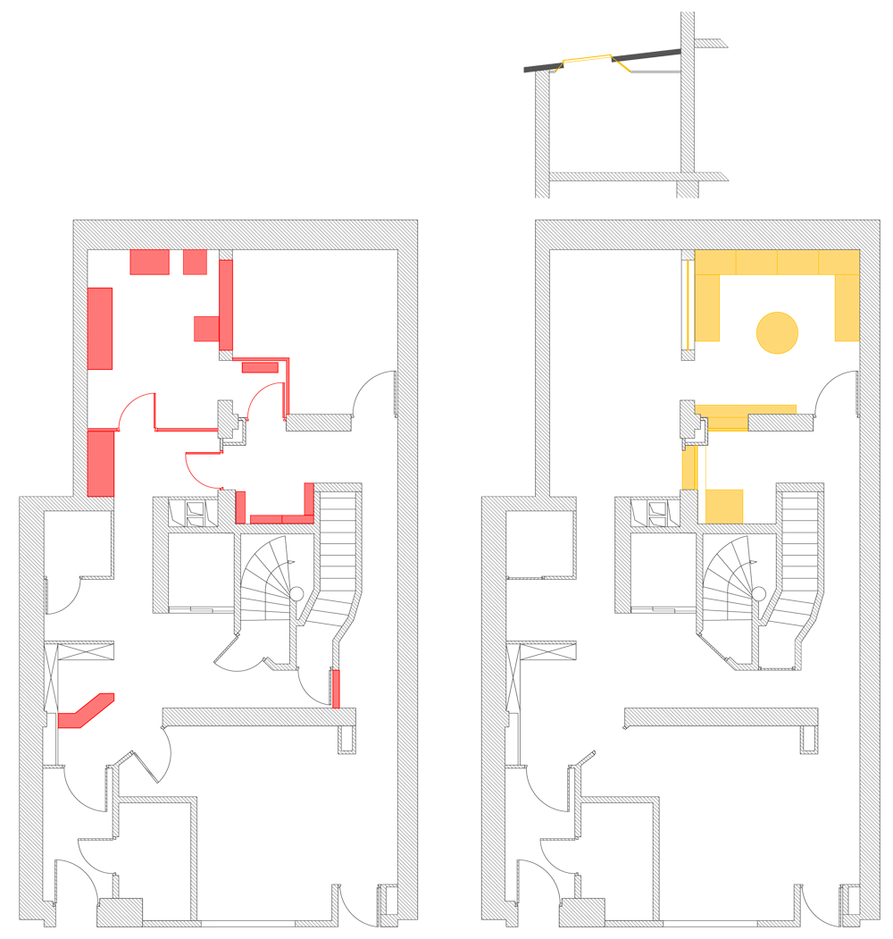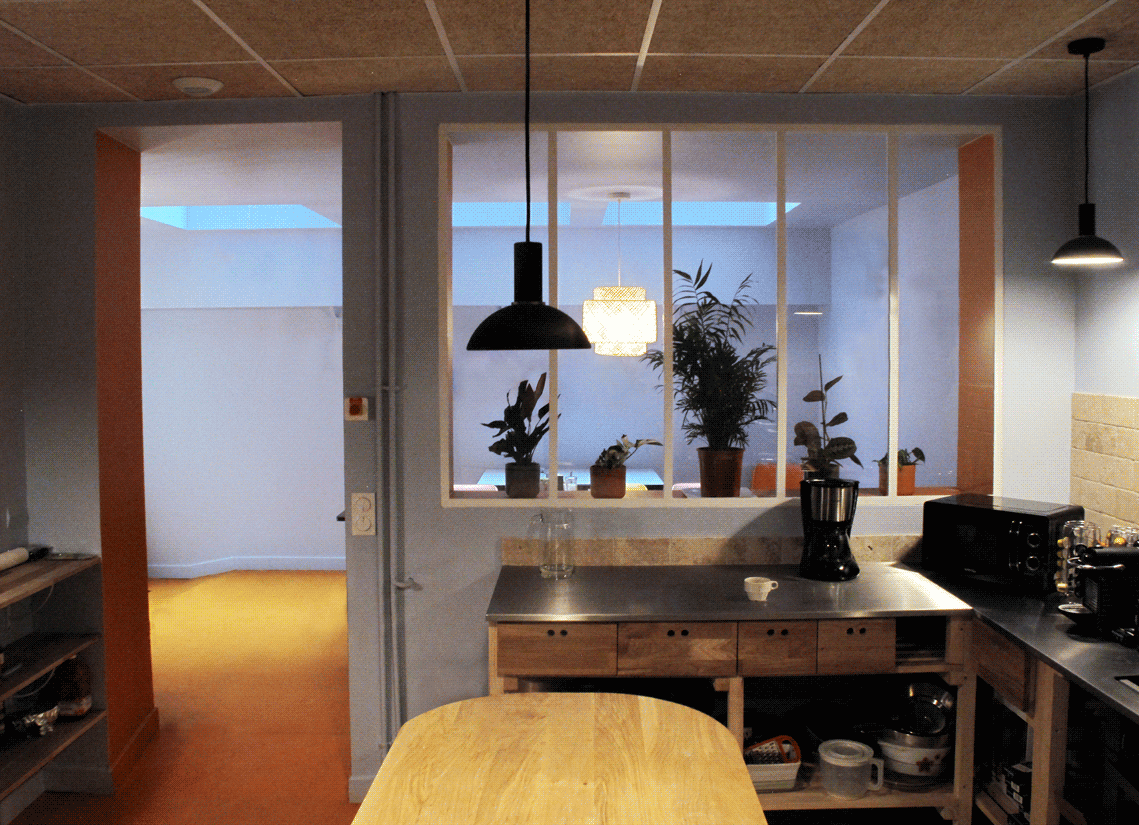 rénovation artisanale de lieux d'entraide, système de construction d'espaces sociaux cohérent • Samusocial de Paris • 2021-22 • Dans une pension de famille logée dans un ancien hôtel réaménagé à bas coût, 38% de la surface du rez-de-chaussée est inutilisée par les habitant·es: la complète absence de lumière naturelle rend la fréquentation de cette partie impossible. Le soin spontané à rechercher l'amélioration de tant d'espace est découragé. Les volumes sont reconfigurés, les fonctions déplacées : une bibliothèque est créée à l'étage, un espace informatique la remplace. Trois fenêtres de toiture rompent l'opacité: l'espace le plus lumineux sera la pièce commune de vie, la pièce attenante est choisie pour cuisiner. Ses modules sont non-industriels, sur-mesure, de haute réparabilité et bon marché.